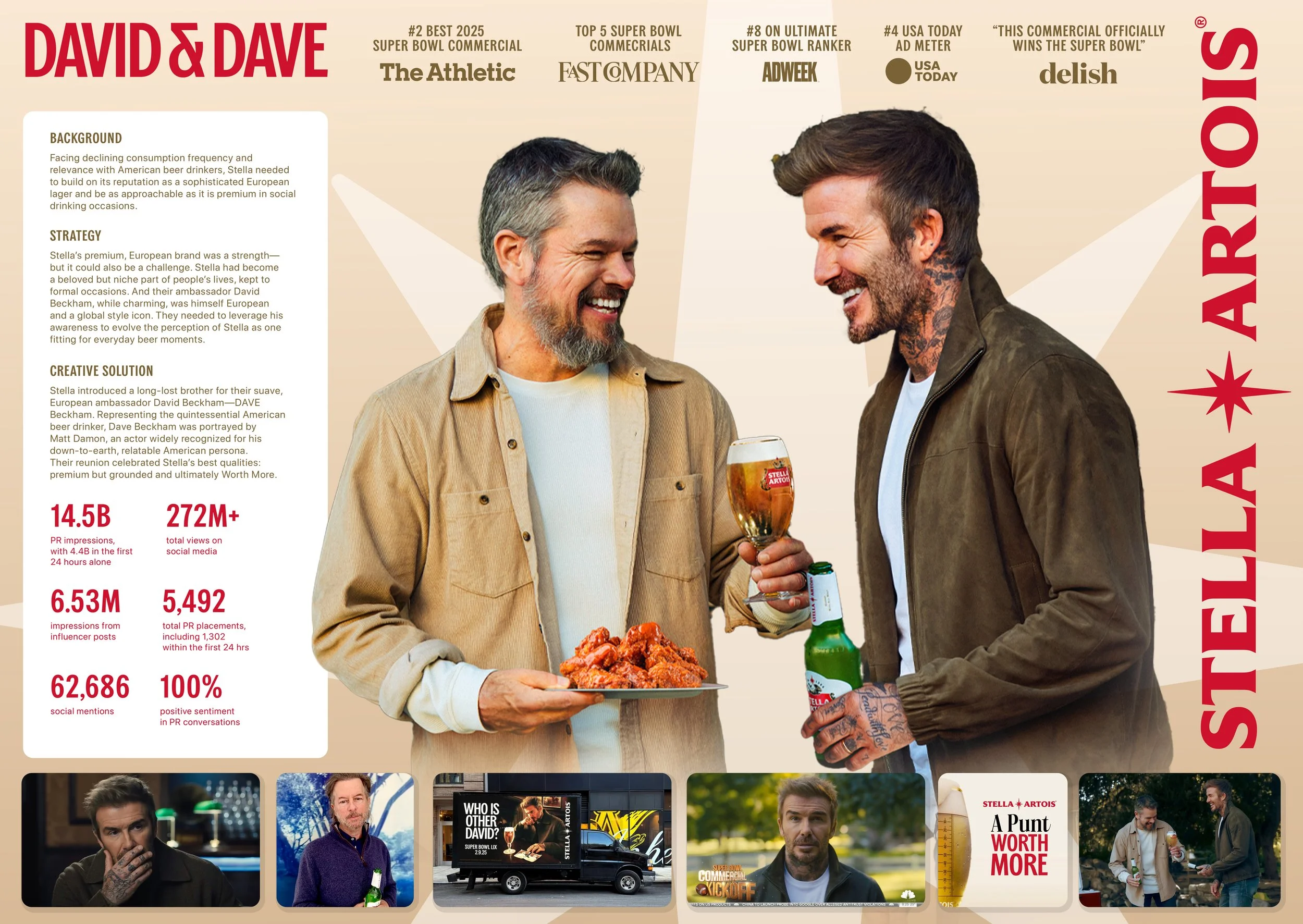 The campaign launched with a teaser and an influencer-driven “search for the other David,” culminating in a Super Bowl spot in which the brothers finally meet and bond over their shared love of beer. The result was a playful, culturally resonant 360 campaign that made Stella feel more relevant, human, and fun.